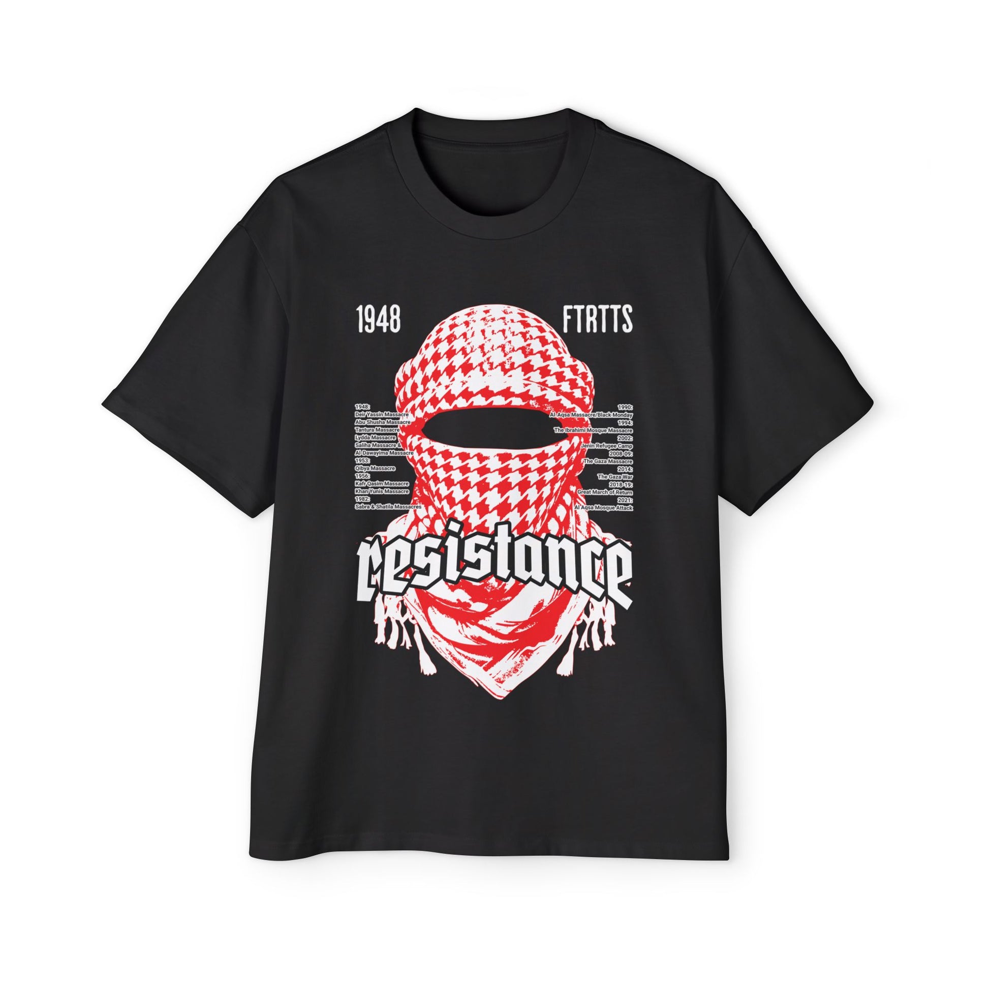 Keffiyeh design overlaid with a list of some of the massacres that have happened in Palestine since the Nakba in 1948.